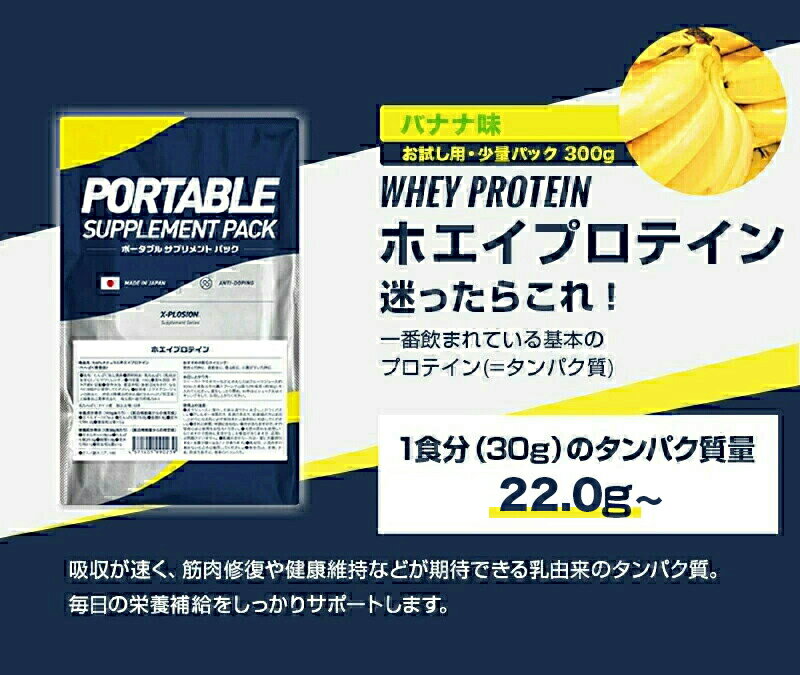 ホエイプロテインバナナ味 名称:たんぱく加工食品(粉末たん白) 内容量:300g/1個 原材料名:乳清たんぱく(乳成分を含む)、乳等を主要原料とする食品、酵母エキス、食塩/乳化剤(大豆由来)、香料、増粘剤(キサンタンガム)、甘味料(スクラロース)、着色料(クチナシ)、酸味料 栄養成分表示(100g当たり) エネルギー・・・・・・・・・・411kcal たんぱく質・・・・・・・・・・70.3g 脂質・・・・・・・・・・・・・9.3g 炭水化物・・・・・・・・・・・11.8g 食塩相当量・・・・・・・・・・0.6g 栄養成分表示(1食30g当たり) エネルギー・・・・・・・・・・123kcal たんぱく質・・・・・・・・・・21.1g 脂質・・・・・・・・・・・・・2.8g 炭水化物・・・・・・・・・・・3.5g ナトリウム・・・・・・・・・・0.2g アミノ酸スコア・・・・・・100 アミノ酸名称(mg/gタンパク) ヒスチジン・・・・・・・・・19 イソロイシン・・・・・・・・62 ロイシン・・・・・・・・・・111 リジン・・・・・・・・・・・96 メチオニン+システイン・・・47 フィエニルアラニン+チロシン 63 スレオニン・・・・・・・・・72 トリプトファン・・・・・・・20 バリン・・・・・・・・・・・55 グルタミン酸・・・・・・・・189 プロリン・・・・・・・・・・63 アルギニン・・・・・・・・・27 セリン・・・・・・・・・・・52 グリシン・・・・・・・・・・19 アスパラギン酸・・・・・・・112 アラニン・・・・・・・・・・53 BCAA含量・・・・・・・・228 使用上の注意 ●水やジュースに溶かした後は速やかにお召し上がりください ●アレルギー体質の方、疾病のある方、妊産婦の方はお召し上がりになる前に必ず医師または薬剤師に相談してください。