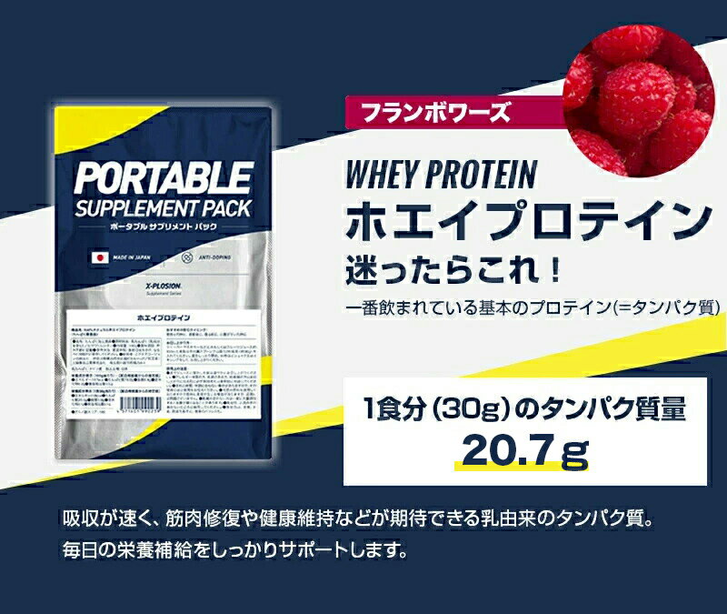 ホエイプロテイン フランボワーズ味 名称:たんぱく加工食品(粉末たん白) 内容量:300g/1個 原材料名:乳清たんぱく(乳成分を含む)、カシスパウダー/酸味料、乳化剤、(大豆由来)、香料、甘味料(スクラロース)、着色料(紅麹) 栄養成分表示(100g当たり) エネルギー・・・・・・・・・・408kcal たんぱく質・・・・・・・・・・69.7g 脂質・・・・・・・・・・・・・8.9g 炭水化物・・・・・・・・・・・12.9g 食塩相当量・・・・・・・・・・0.5g 栄養成分表示(1食30g当たり) エネルギー・・・・・・・・・・122kcal たんぱく質・・・・・・・・・・20.9g 脂質・・・・・・・・・・・・・2.7g 炭水化物・・・・・・・・・・・3.9g ナトリウム・・・・・・・・・・0.2g アミノ酸スコア・・・・・・・・・・100 ●アミノ酸名称・・・・・・・mg/gタンパク ヒスチジン・・・・・・・・・19 イソロイシン・・・・・・・・62 ロイシン・・・・・・・・・・111 リジン・・・・・・・・・・・96 メチオニン+システイン・・・47 フィエニルアラニン+チロシン 63 スレオニン・・・・・・・・・72 トリプトファン・・・・・・・20 バリン・・・・・・・・・・・55 グルタミン酸・・・・・・・・189 プロリン・・・・・・・・・・63 アルギニン・・・・・・・・・27 セリン・・・・・・・・・・・52 グリシン・・・・・・・・・・19 アスパラギン酸・・・・・・・112 アラニン・・・・・・・・・・53 BCAA含量・・・・・・・・228 使用上の注意 ●水やジュースに溶かした後は速やかにお召し上がりください ●アレルギー体質の方、疾病のある方、妊産婦の方はお召し上がりになる前に必ず医師または薬剤師に相談してください。