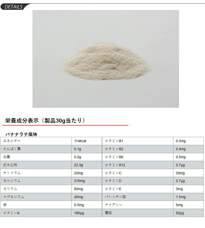 ●栄養成分表示(製品30g当たり)● エネルギー:114kcal、たんぱく質:5.1g、脂質:0.2g、炭水化物:22.9g ナトリウム:20mg、カルシウム:310mg、カリウム:80mg、マグネシウム:45mg、鉄:0.5mg 【諸注意】 プロテインパウダーは食品です。